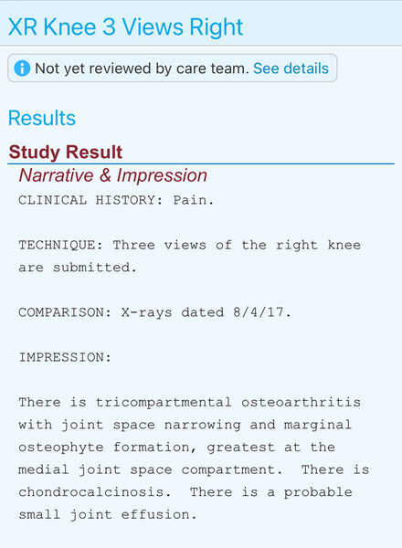 I was sitting at home when I received a phone notification that a new test result was available for me to review on the patient portal for the electronic medical record system used by my healthcare providers. I clicked the link, logged in, and there it was: my knee x-ray images and the radiologist’s report.
