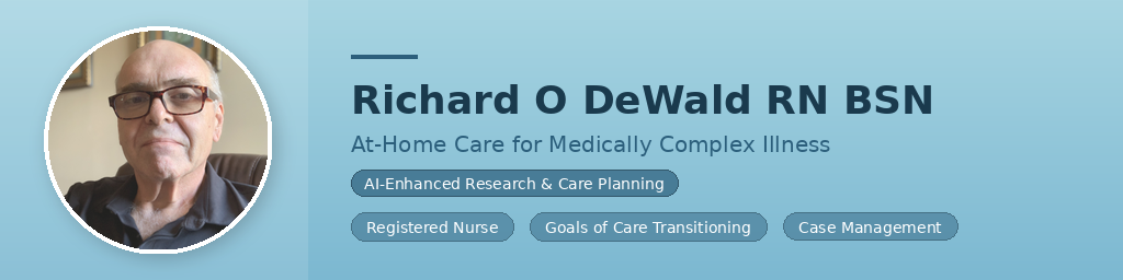 Welcome to the website of Richard DeWald RN BSN, specialist in end-of-life clinical informatics and medically complex healthcare management. I serve in two ways: by this freely available website and through personalized in-home and virtual consultations.